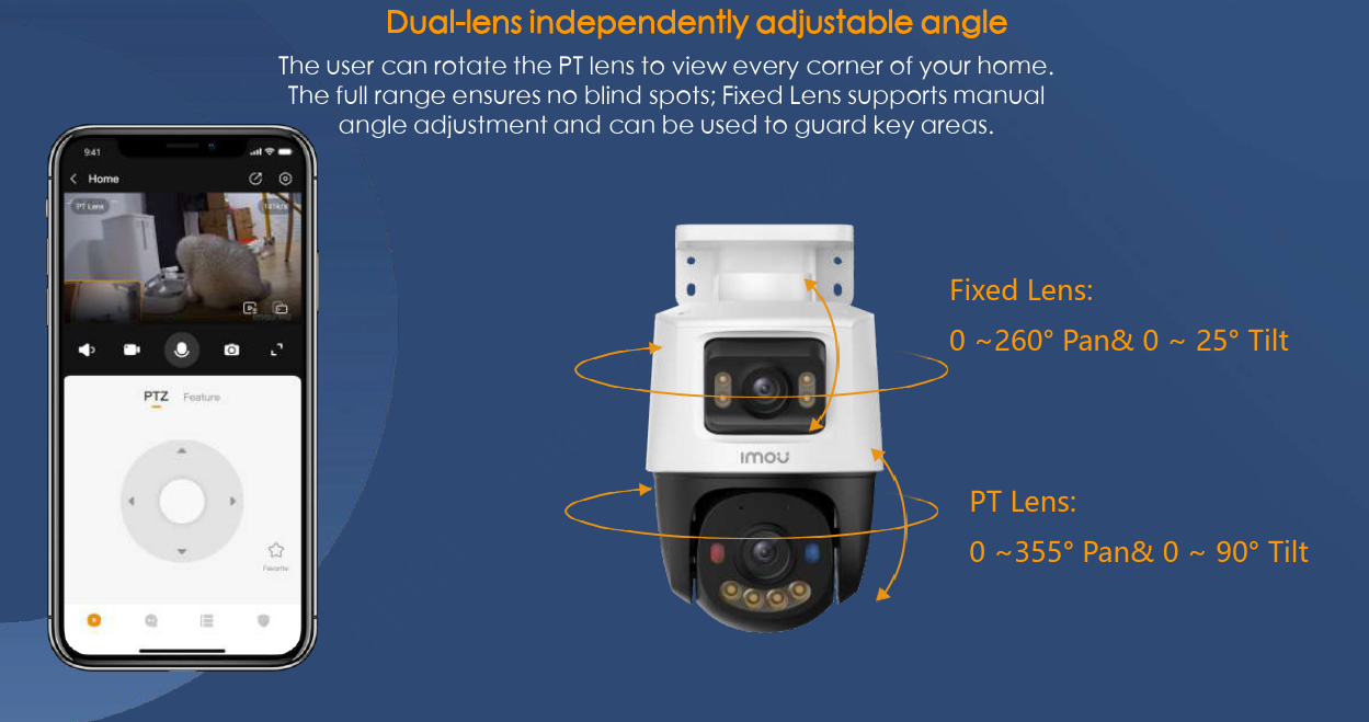 IMOU PS70F PoE là dòng camera an ninh cao cấp trang bị hai ống kính độc lập gồm 1 ống kính cố định và 1 ống kính quay quét. Thiết kế này cho phép giám sát đồng thời hai khu vực hoặc hai góc nhìn khác nhau, giúp một chiếc PS70F có thể thay thế hai camera truyền thống.