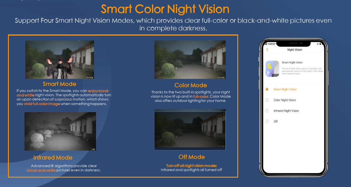 Smart Color Night Vision: Hỗ trợ 4 chế độ nhìn đêm, đảm bảo hình ảnh rõ nét ngay cả trong bóng tối hoàn toàn.