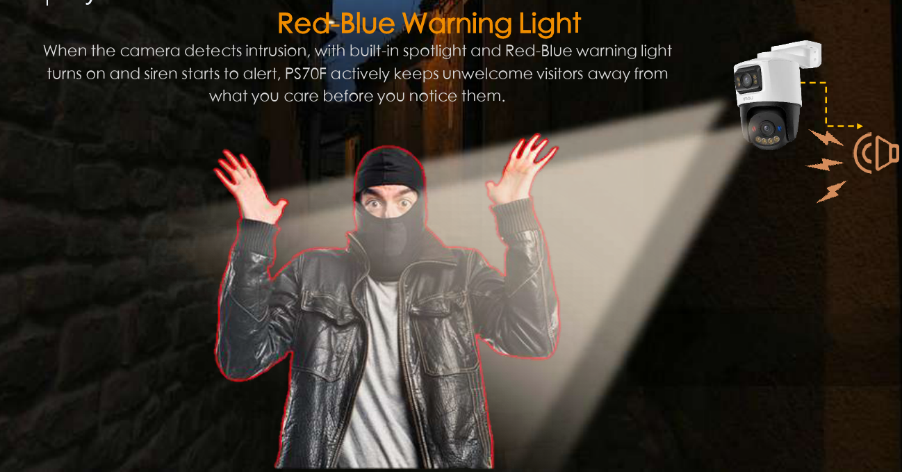Camera hỗ trợ xoay toàn cảnh 355° – nghiêng 90°, tích hợp đèn cảnh báo đỏ-xanh, đèn chiếu spotlightcòi báo động 110dB, mang đến khả năng răn đe chủ động trước các hành vi xâm nhập. Với công nghệ IMOU SENSE – thuật toán trí tuệ nhân tạo độc quyền, PS70F nhận diện chính xác người và phương tiện, giảm thiểu cảnh báo sai và tối ưu an ninh cho gia đình.