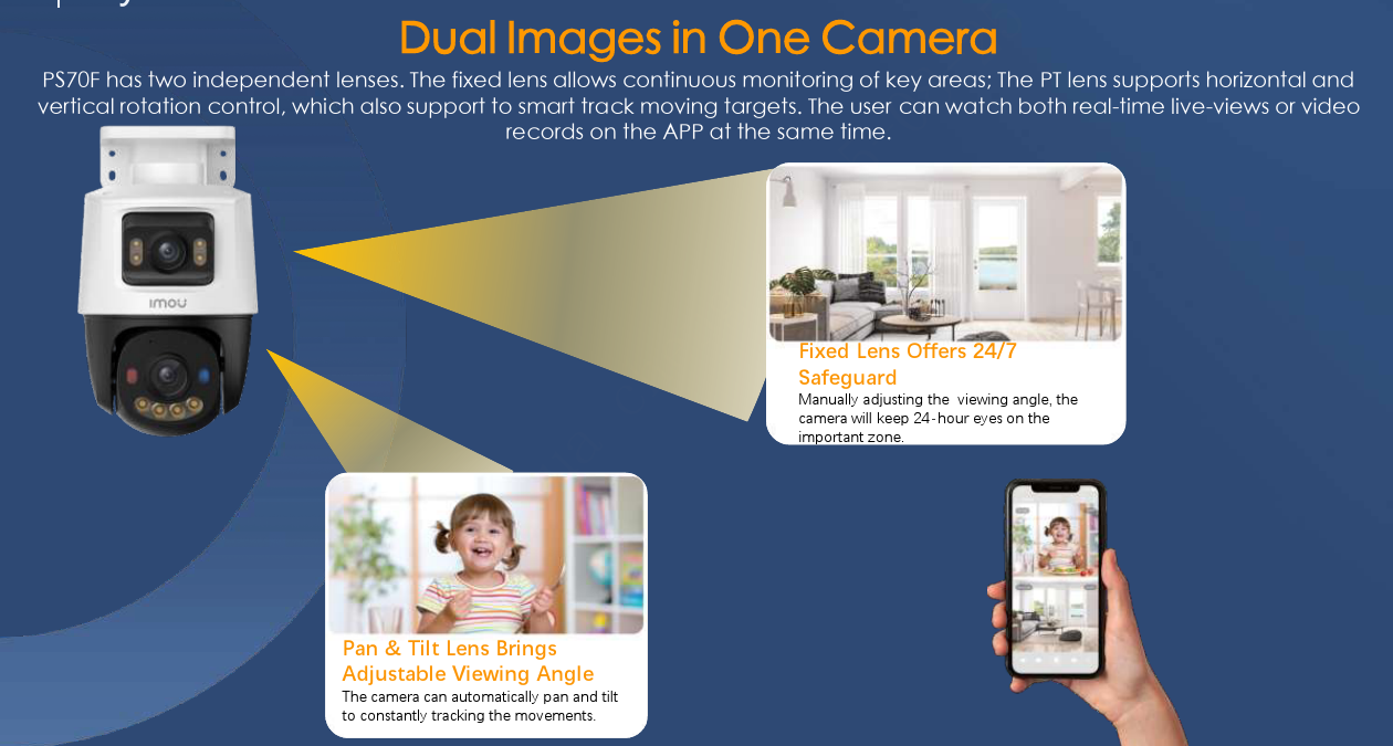 IMOU PS70F PoE là dòng camera an ninh cao cấp trang bị hai ống kính độc lập gồm 1 ống kính cố định 3MP và 1 ống kính quay quét 3MP, cho tổng độ phân giải lên tới 6MP. Thiết kế này cho phép giám sát đồng thời hai khu vực hoặc hai góc nhìn khác nhau, giúp một chiếc PS70F có thể thay thế hai camera truyền thống.