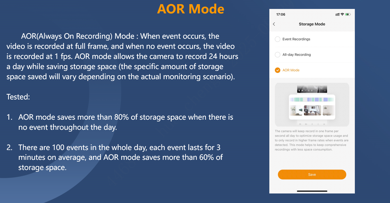 Chế độ AOR (Always-On-Record) – Ghi hình liên tục, tiết kiệm dung lượng lưu trữ.