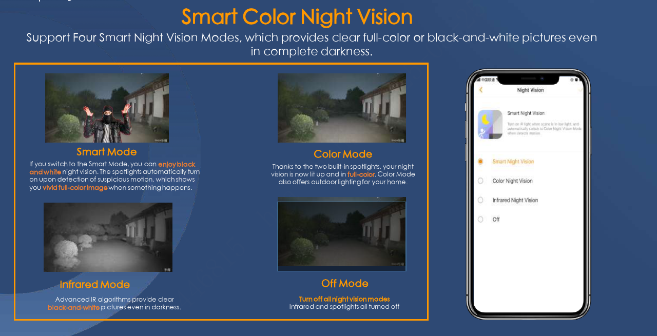 4 chế độ quan sát ban đêm thông minh, đảm bảo hình ảnh rõ nét ngay cả trong bóng tối hoàn toàn.