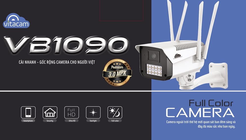 CAMERA VITACAM VB1090-3MPX CAMERA QUAN SÁT ĐÊM ĐẦY MÀU SẮC HỆ THỐNG 10 ĐÈN LED ĐỘ SÁNG CÔNG SUẤT CAO, ĐỘ PHÂN GIẢI 3.0 MPX CHUẨN ULTRA HD, GÓC QUAN SÁT RỘNG