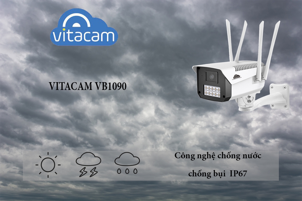 Vitacam VB1090 là loại camera IP chuyên thi công và lắp đặt ngoài trời được trang bị tiêu chuẩn chống nước IP67 giúp cho VB1090 có thể lắp đặt tại mọi vị trí mà không cần quan tâm đến điều kiện thời tiết