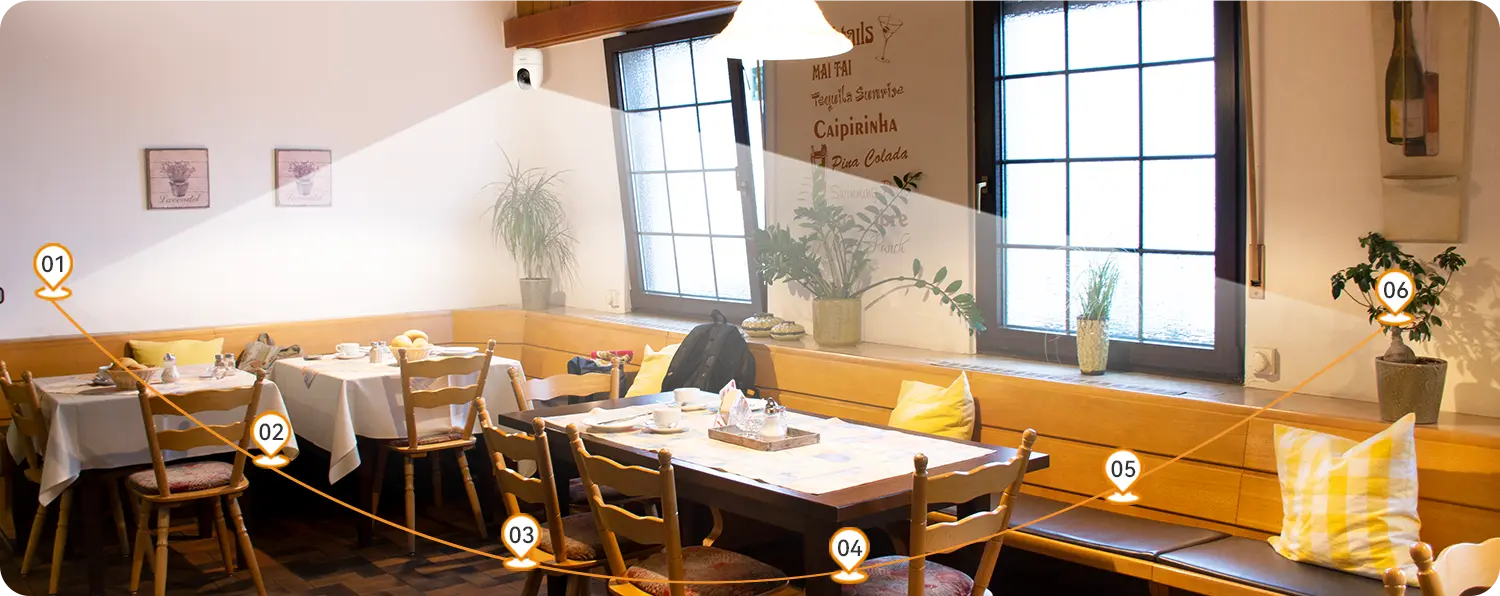 Camera hỗ trợ xoay ngang 360 độ, cho phép giám sát toàn bộ không gian mà không có điểm mù. Tính năng theo dõi chuyển động tự động giúp camera luôn giữ đối tượng trong khung hình khi phát hiện chuyển động, nâng cao hiệu quả giám sát liên tục.
